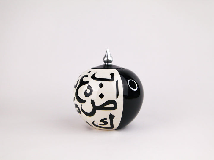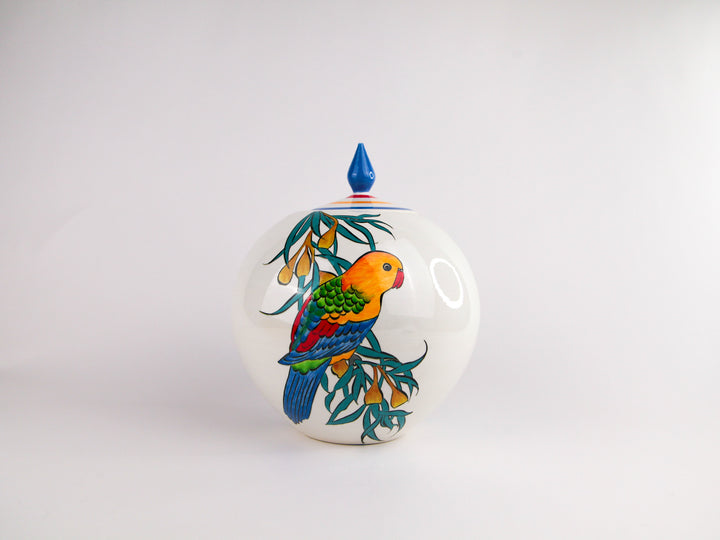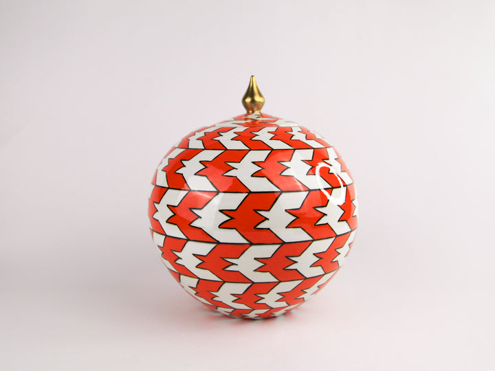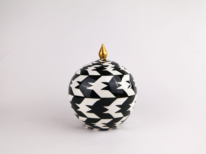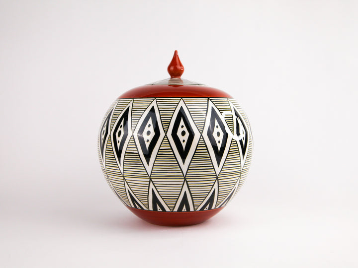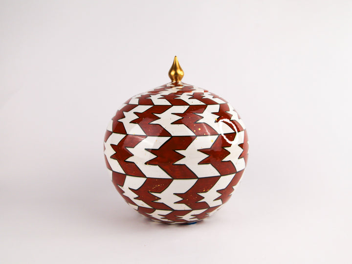 A one-of-a-kind, hand-thrown spherical ceramic container that is hand-painted with intricate detail featuring a lid with a decorative finial. Utilize it as a handmade treasure holder, as a vase for floral arrangements, or displaying as a decorative accent in your home.